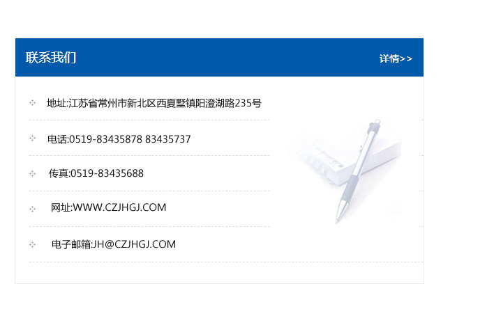 地址:常州市新北區友邦商務大廈1幢16、17層  電話:0519-85101652  傳真:0519-85112595  郵編:213022  網址:www_cz-jiayue_cn.sirong-cn.com  郵箱:xiajifengaa@163.com